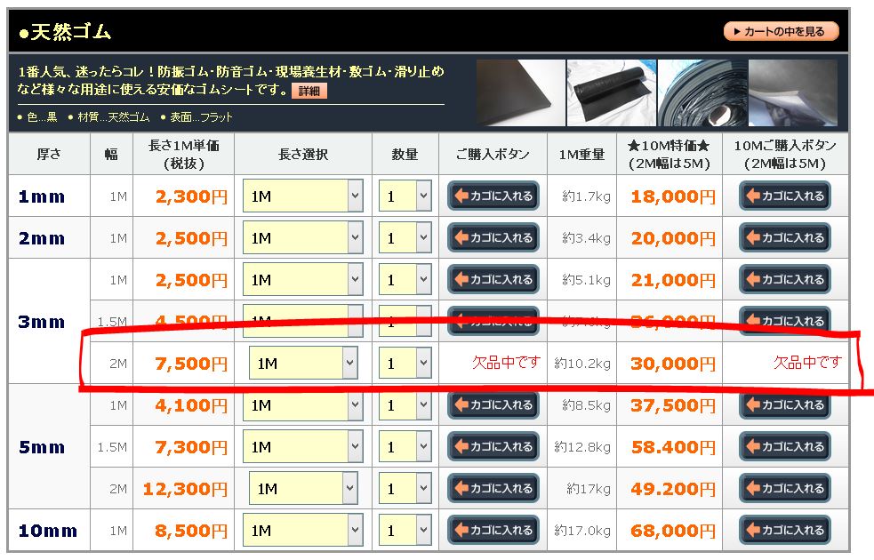 【お詫び】天然ゴム3mm厚×幅2000mmが欠品してます