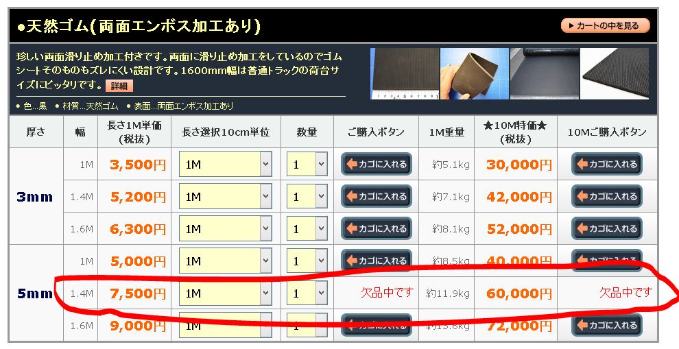 天然ゴム(両面エンボス加工あり)5mm厚×幅1400mmが欠品してます