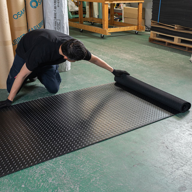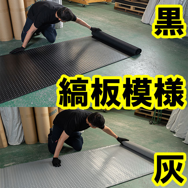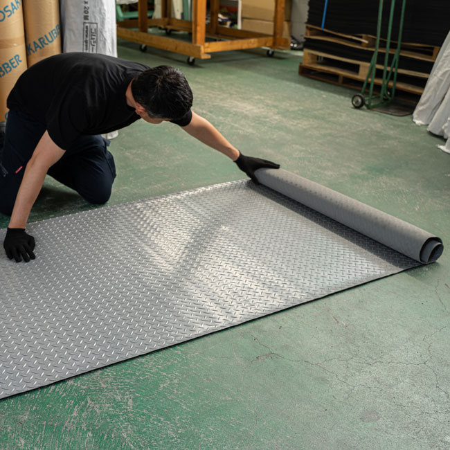 一般的に養生ゴムシートとしてお使いいただいているてっぱんゴムシートですが、縞板柄の雰囲気が良いのでガレージマットによくお使いいただきます。特にバイクガレージのマットととしてご依頼いただくケースが多く、実際の設置写真を拝見してもバイクのカッコよさ、ガレージづくりのセンスの良さに加えて、僭越ですがてっぱんゴムシートもわずかながら貢献できているのではないかと思います。黒と灰の2色があります。
