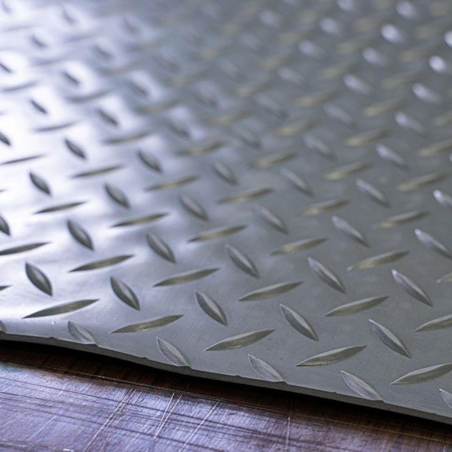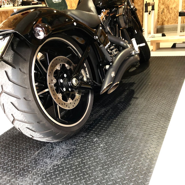 縞板柄(チェッカープレート模様)のてっぱんゴムシートはバイクのガレージマットにオススメです。