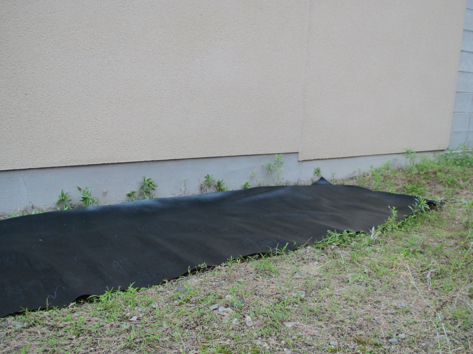 除草された後に3mmのゴムシートを敷いて防草しておられます。この時はゴムシートを敷く幅、880mmにカットして納品させていただきました。この場合はワケ有り品の価格ではなくなりますが、ピタリの寸法で敷き詰めることができますので美しく仕上がります。