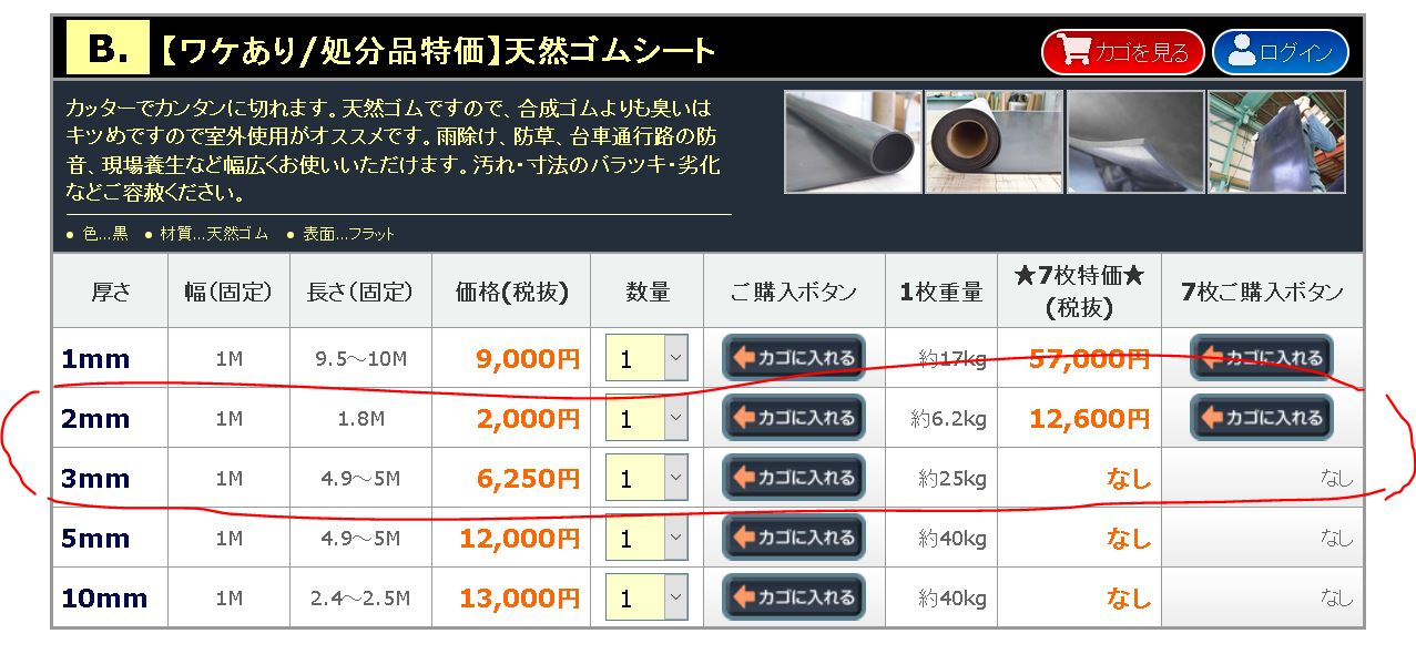 上の画像の【ワケあり/処分品特価】天然ゴムシートの2mmか3mmがオススメです。かなりの特価ですので、大量に敷く場合などでも思い切ってお使いいただけるかと思います。この処分品はタイミングによっては販売中断していることもありますが、その場合はお問い合わせいただけると在庫が残っていることもあります。ご連絡ください。