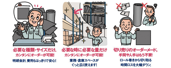 私たちゴムシートドットコムをみなさんの自社倉庫のようにお使いいただくイメージです。