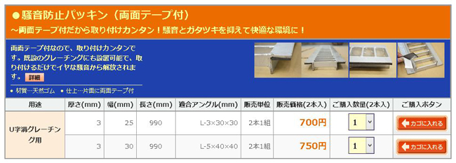 グレーチングの騒音防止パッキンだけでもご注文いただけます。