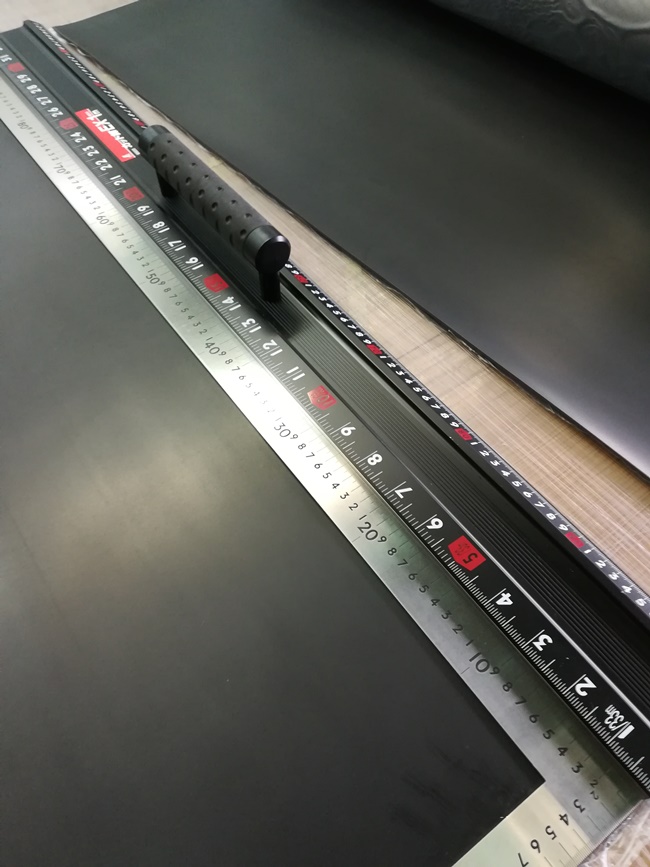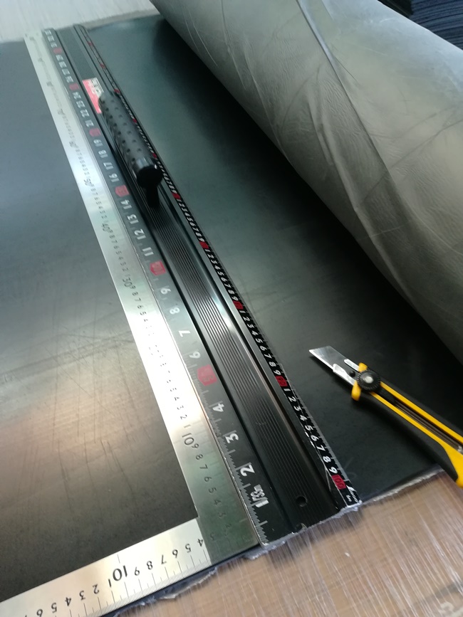 切るゴムは、1mとか2mとかの幅で、10mとかのながーい長いものが原材料なので、そいつを2mものでっかいものさしで測ってカッターナイフで切りました。