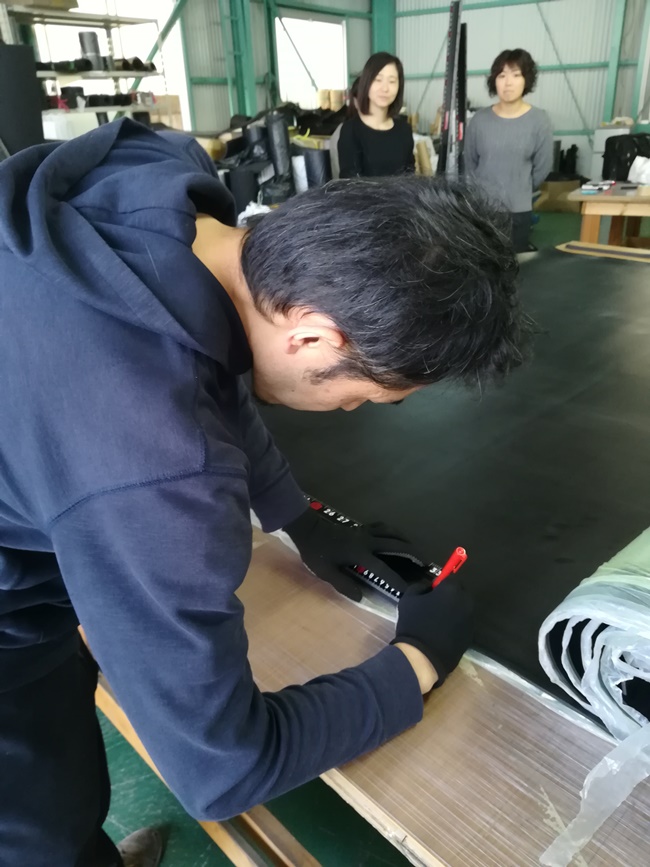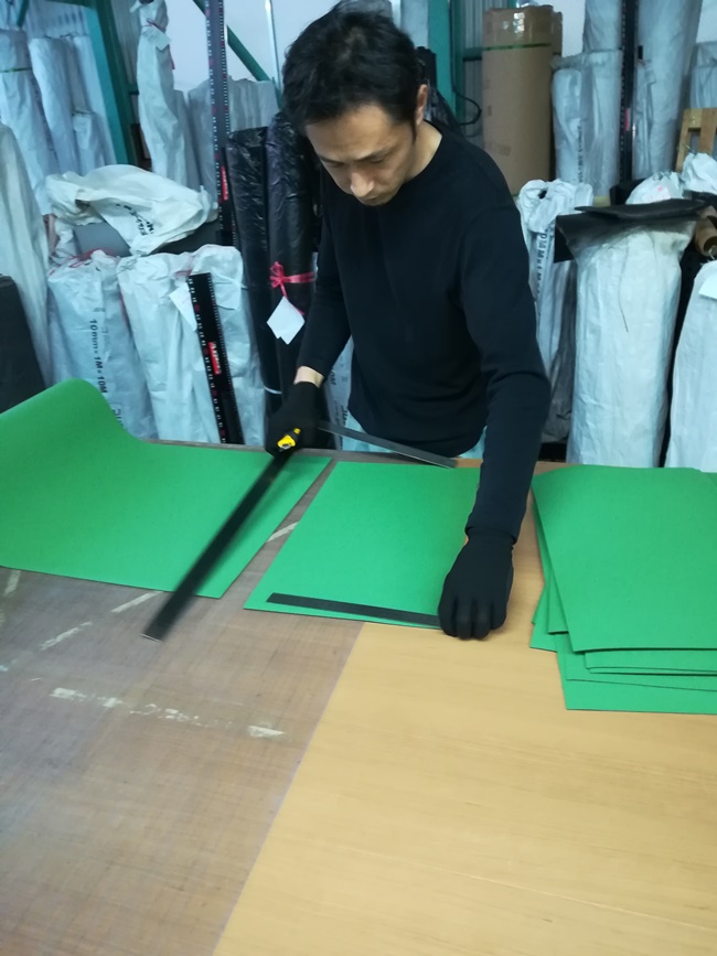 緑のゴムシートを華麗にカットするイケメンスタッフ・トミー!!