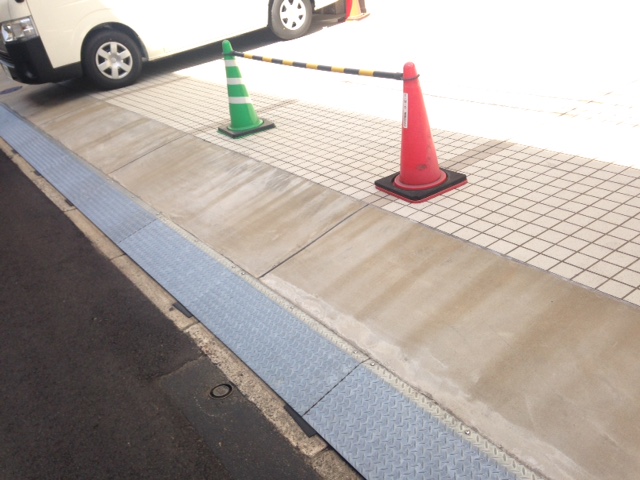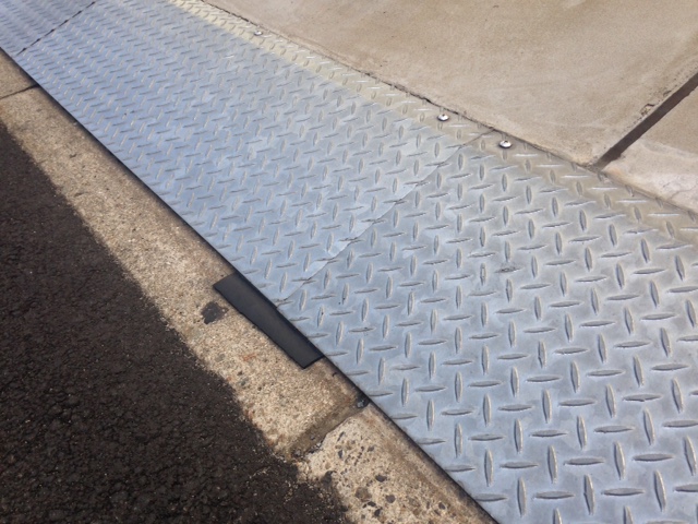 縞鋼板の歩道上がりにゴムマットが使われてました。