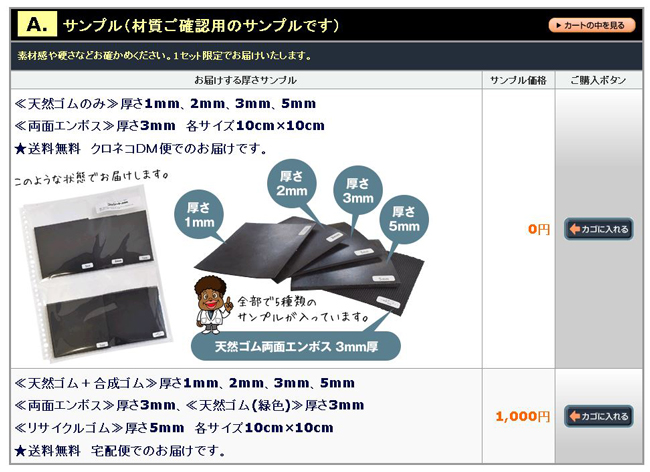 以下は2016年4月5日に掲載された内容です。現在も無料サンプル・有料サンプルをご用意しておりますが、サンプルとして選べるゴムシートの種類が増えております。最新のサンプルについてはこちらをご覧くださいませ。