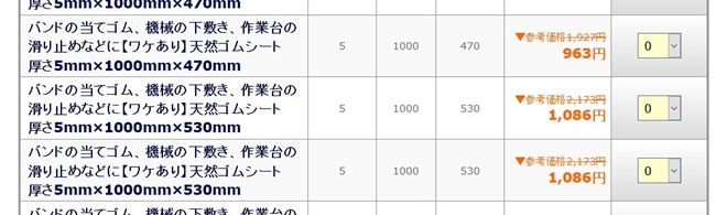 ボク「えっと・・・ワケあり天然ゴムの端材コーナーで5mmのところをポチっと押して。。あ、これかな。5mmで、1m幅の530ミリってのが、あります。おお!お値段が!!1枚¥1086ってなってるやないですか!!これ2枚買えばほとんど半額やないですか!!」