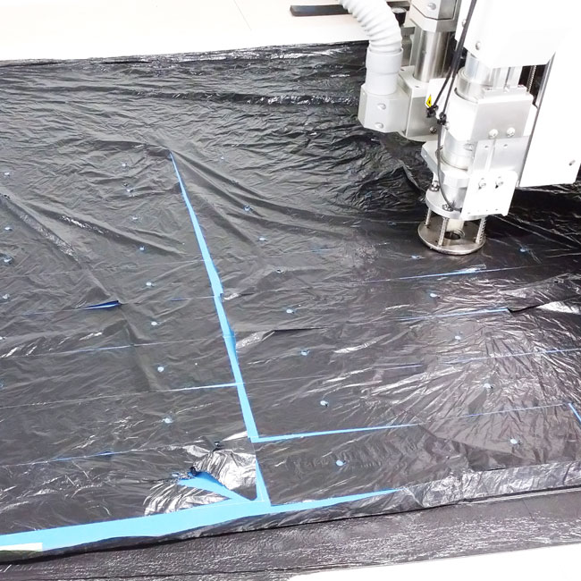 黒いビニールシートをかぶせることでヘッド部はシートを滑るように動いてくれます。さらに、この機械はゴムを固定するために掃除機のようにゴムを吸いながらカットしてくれるのですが、ビニールをかぶせることでビニールごと吸着してくれるので、さらにしっかりとゴムを固定してくれるのです。