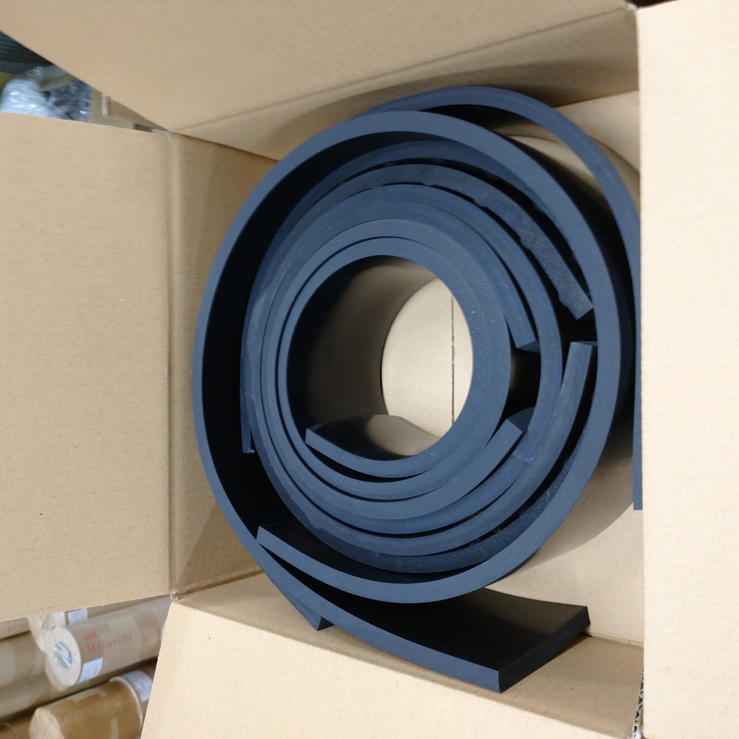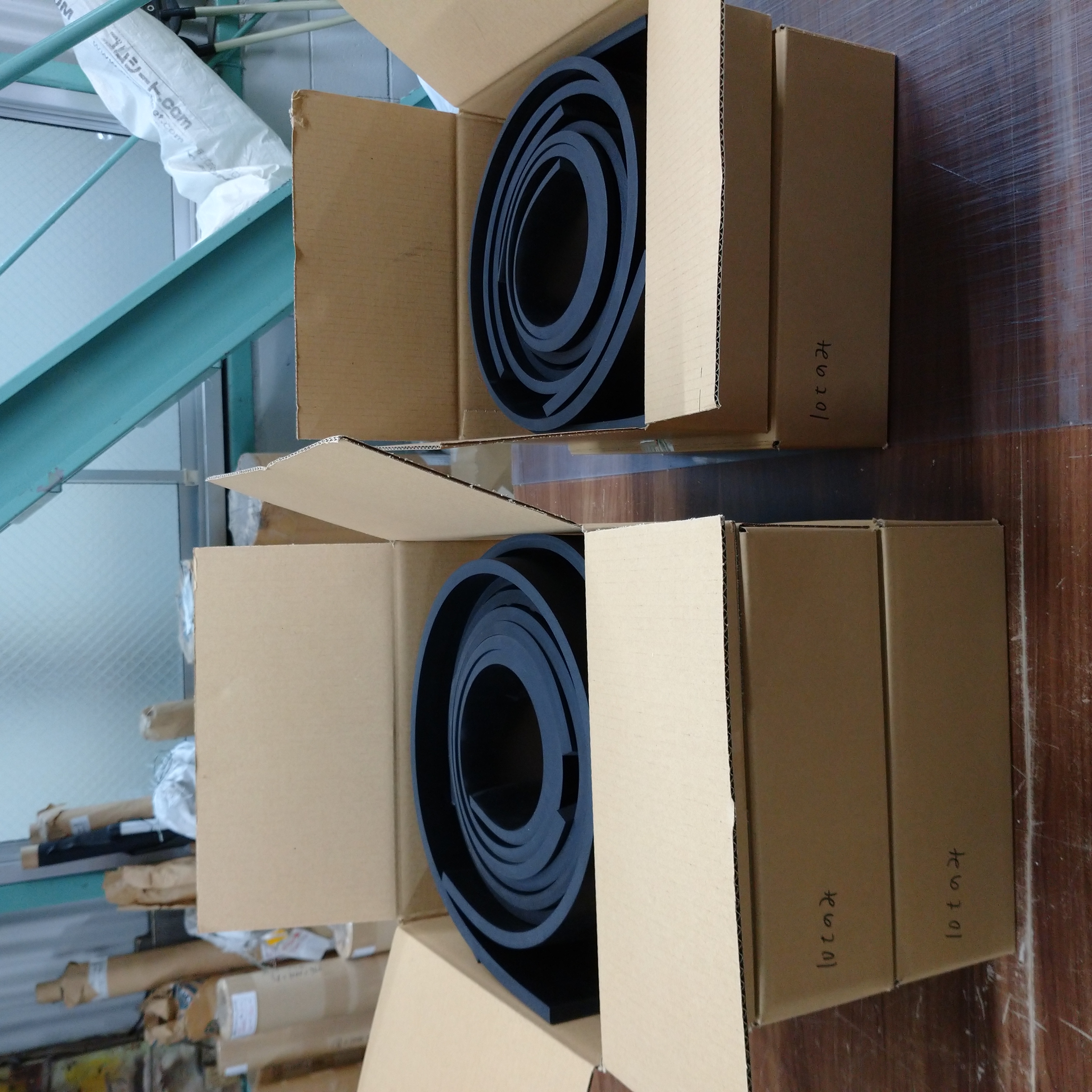 ゴムシート.comはゴムの加工もしていますのでゴムの残材がたくさん出ます。小さな小さなゴムのクズから、大きなものまで残材は様々な大きさ、形状です。加工で使えないような残材は産業廃棄物になります。要するに廃棄ですね。加工で使えないゴム残材は私たちの出荷時の梱包で再利用することも多いです。例えばPPバンドでギューっと締め付けるときの角当てですね。ゴムを1枚はさむだけで商品への食い込みを緩和できるのと同時に、PPバンドが不用意に切れてしまうことも防げます。こういうのでけっこうな残材が使えます。環境のためにも廃棄料金を減らすためにもゴミは減らしたいですからね。