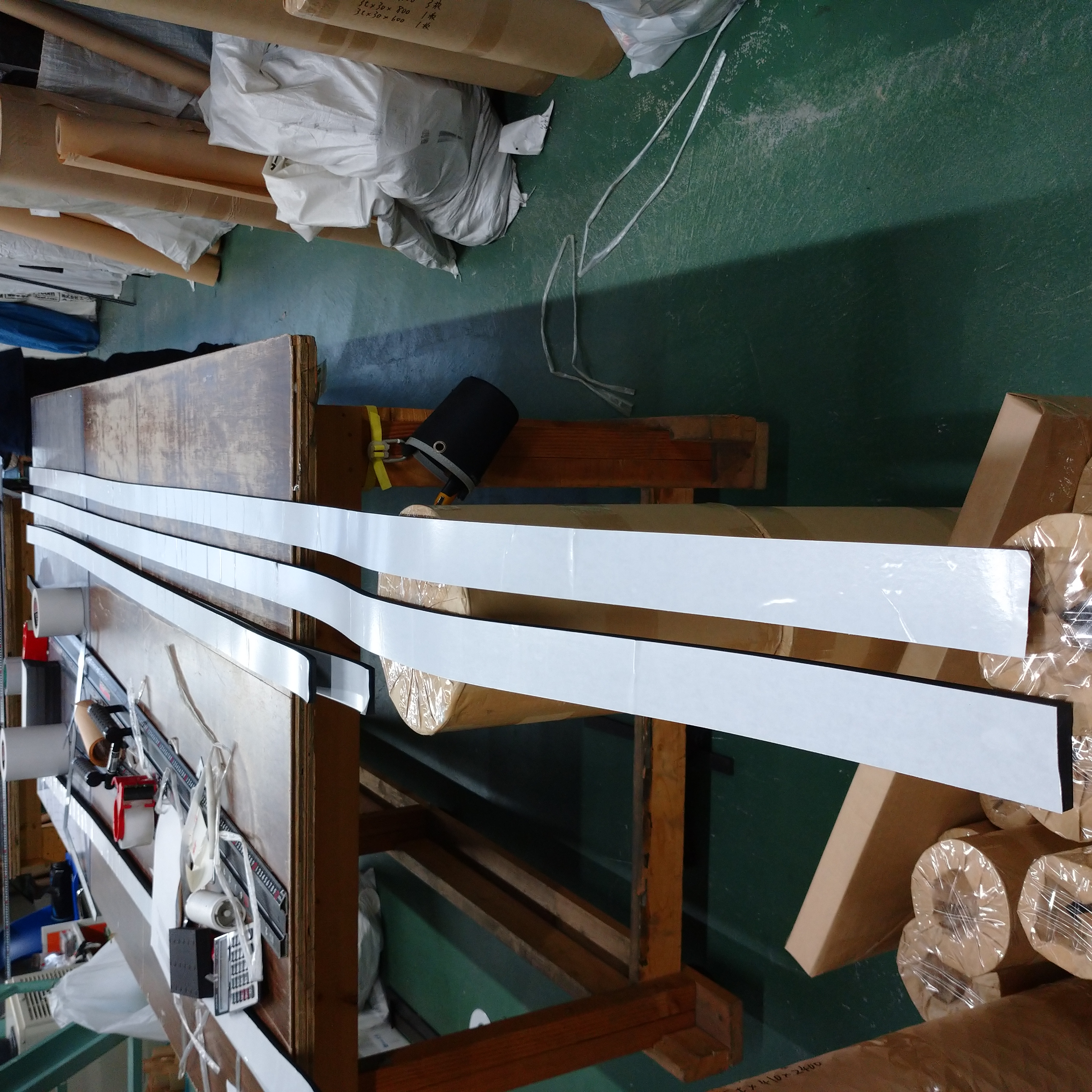 先に写真を見ていただきますね。幅50mm×長さ2700mm程度のゴムの片面にテープをつけています。このように白色の剥離紙をつけたまま梱包して納品いたしますので、現場で剥離紙を剥がしてすぐに貼り付けられます。
