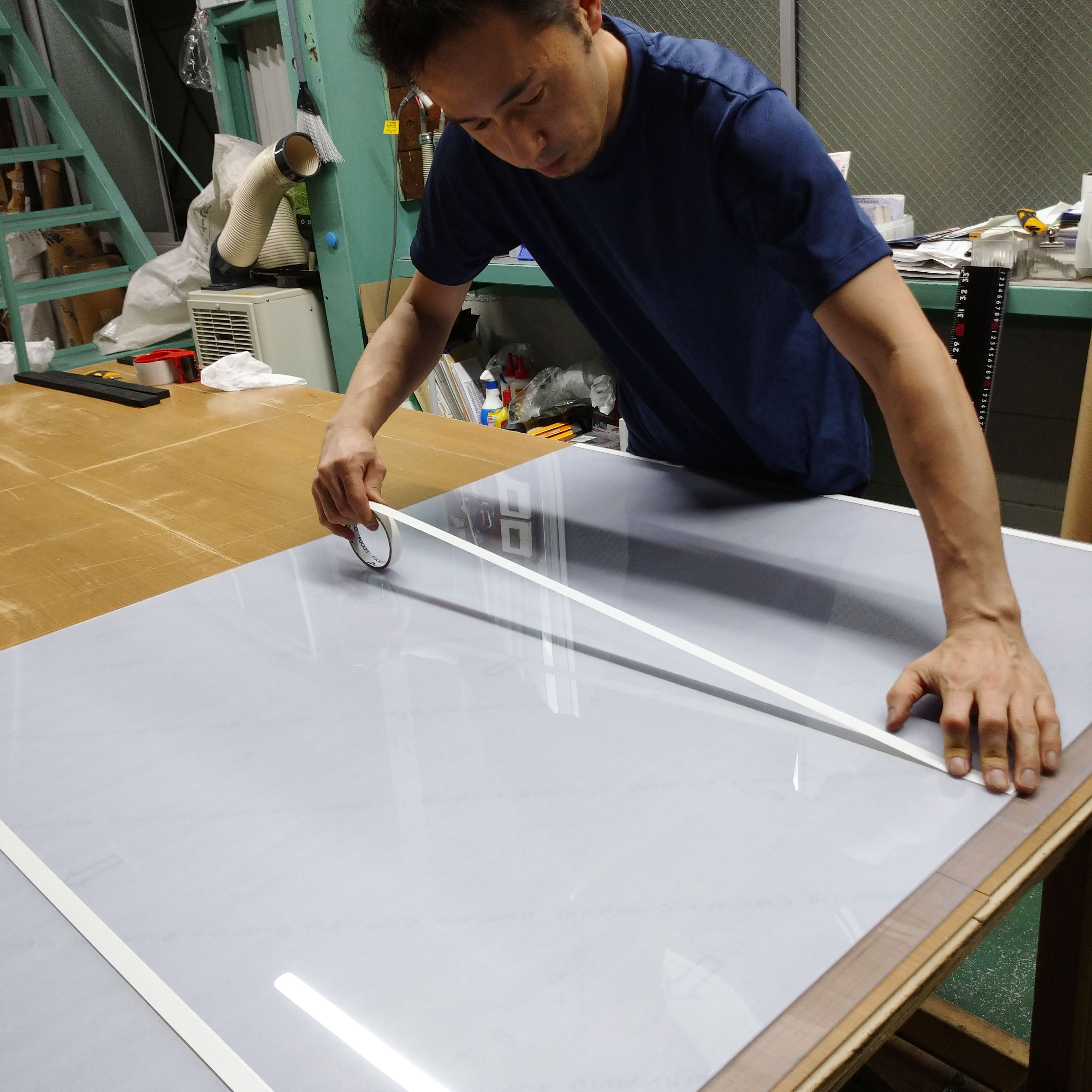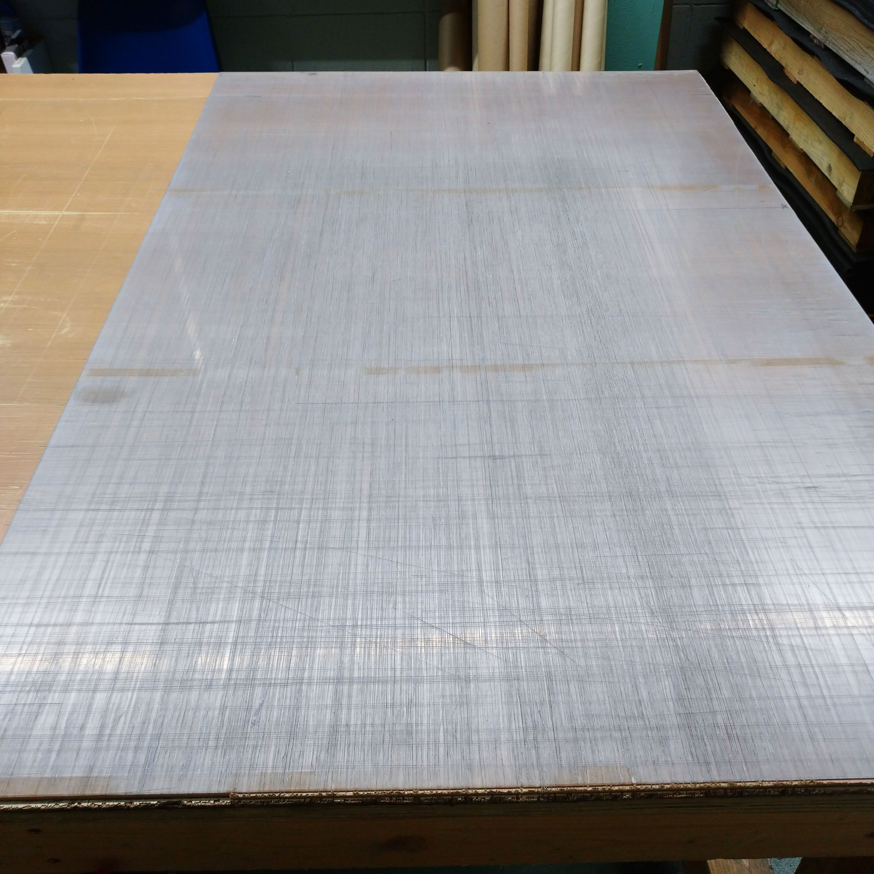 ゴムシート.comでは規格幅はそのままでご指定の長さにカットすることがメインのお仕事です。その場合はカッターナイフで手切りしますが、地面に這いつくばって作業すると腰を痛めますし商品も汚れてしまいます。そのため自作の作業台で採寸からカット、梱包までしています。作業台はホームセンターで木材を買ってきて組み立てました。天板も木材です。作業台は非常に丈夫に出来上がり、キャスター付きなのでちょっとした移動もカンタンです。が、一点だけ問題がありました。それは木材なのでカッターの刃でボロボロになることです。。。すぐにダメになるわけではないのですが、カッターの刃で削った木クズが出てしまうので、ゴムシートに付着してしまうのです。