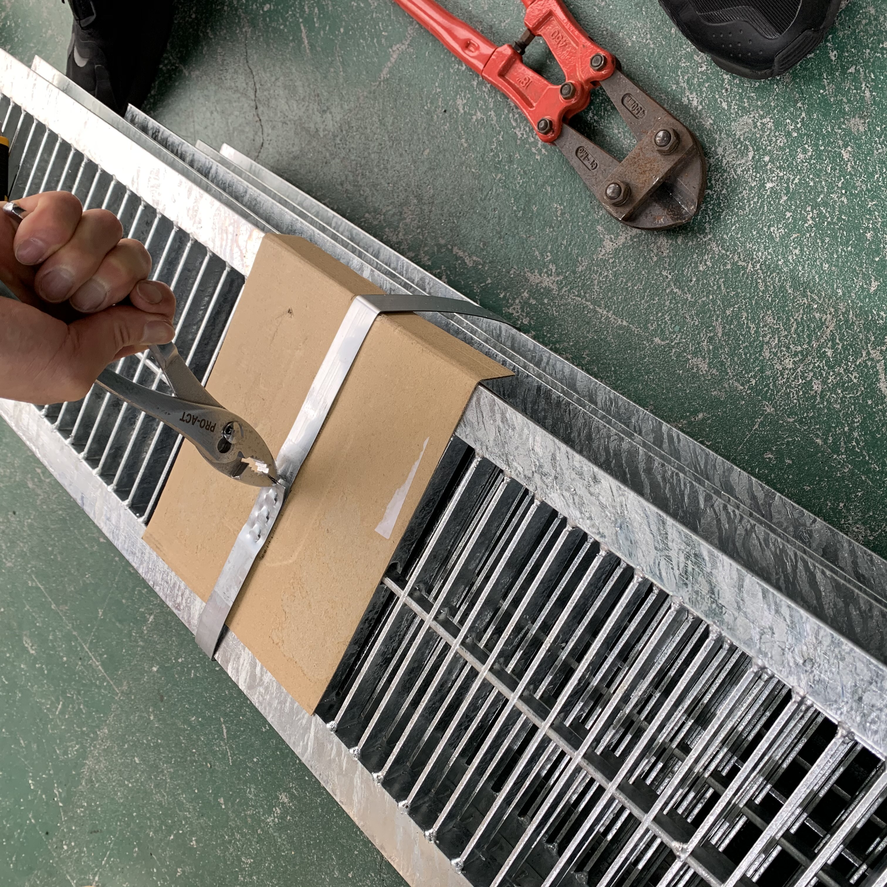グレーチングはパレットに帯鉄で固定することが多いです。PPバンドだと切れる場合があるので帯鉄で荷造りすることがあるのですね。直送元のメーカーさんにはバンドカッターをお持ちでないお客様が多いので出来るだけPPバンドでの荷造りをお願いしていますが、安全第一のため、最終的なご判断はメーカーさんの荷造り担当の方にお願いをしています。