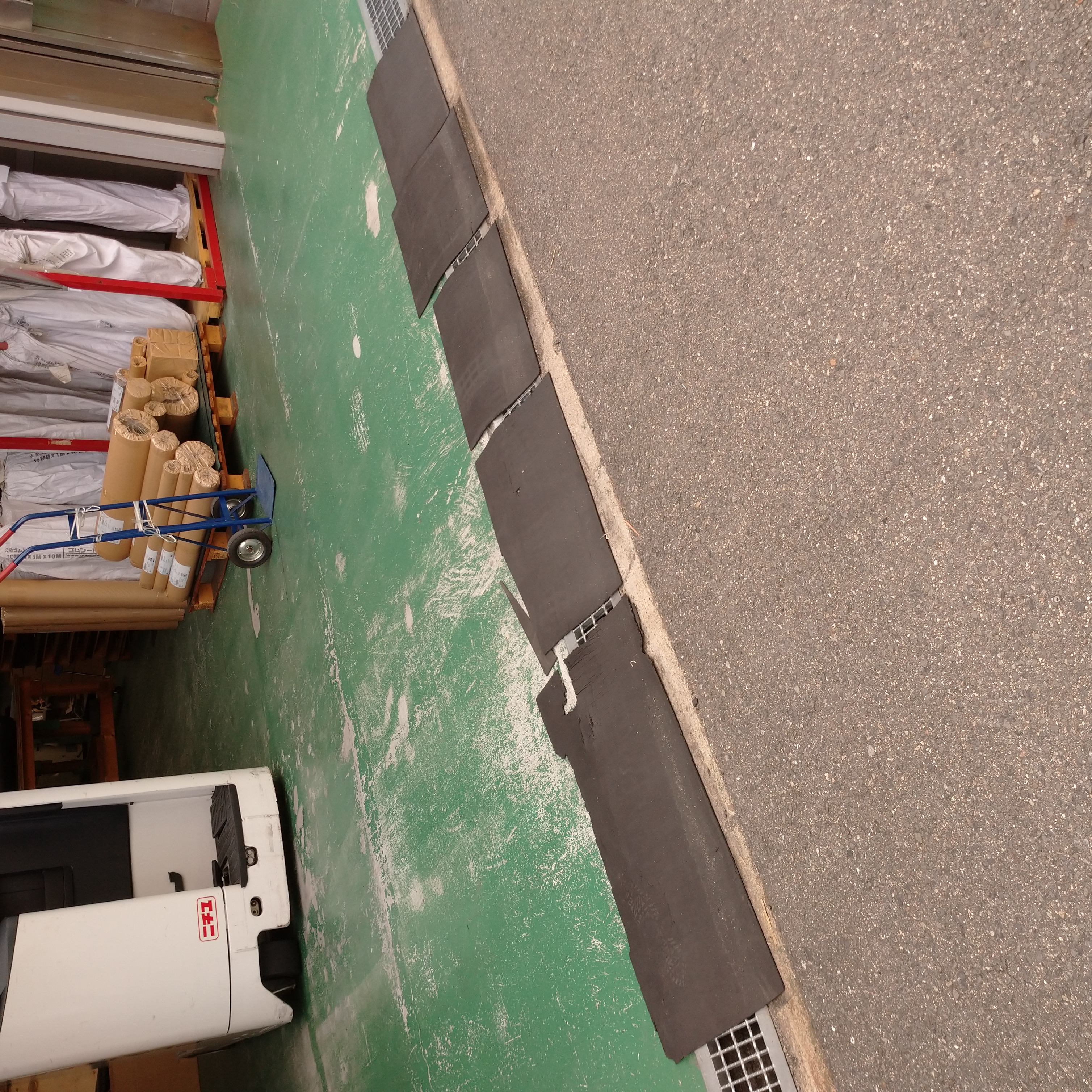 工場出入り口のグレーチング保護と滑り止めのためにゴムマットを敷いています。天然ゴム厚さ5mmが4枚と奥(右)から2枚目のみ天然ゴム両面エンボス厚さ5mmです。少し傾斜になっているので上り下り時に強い負荷がグレーチングにかかって破損するかもしれませんので、ゴムマットで保護するとともにグレーチングは金属で滑りやすいため滑り止めの効果も期待しています。