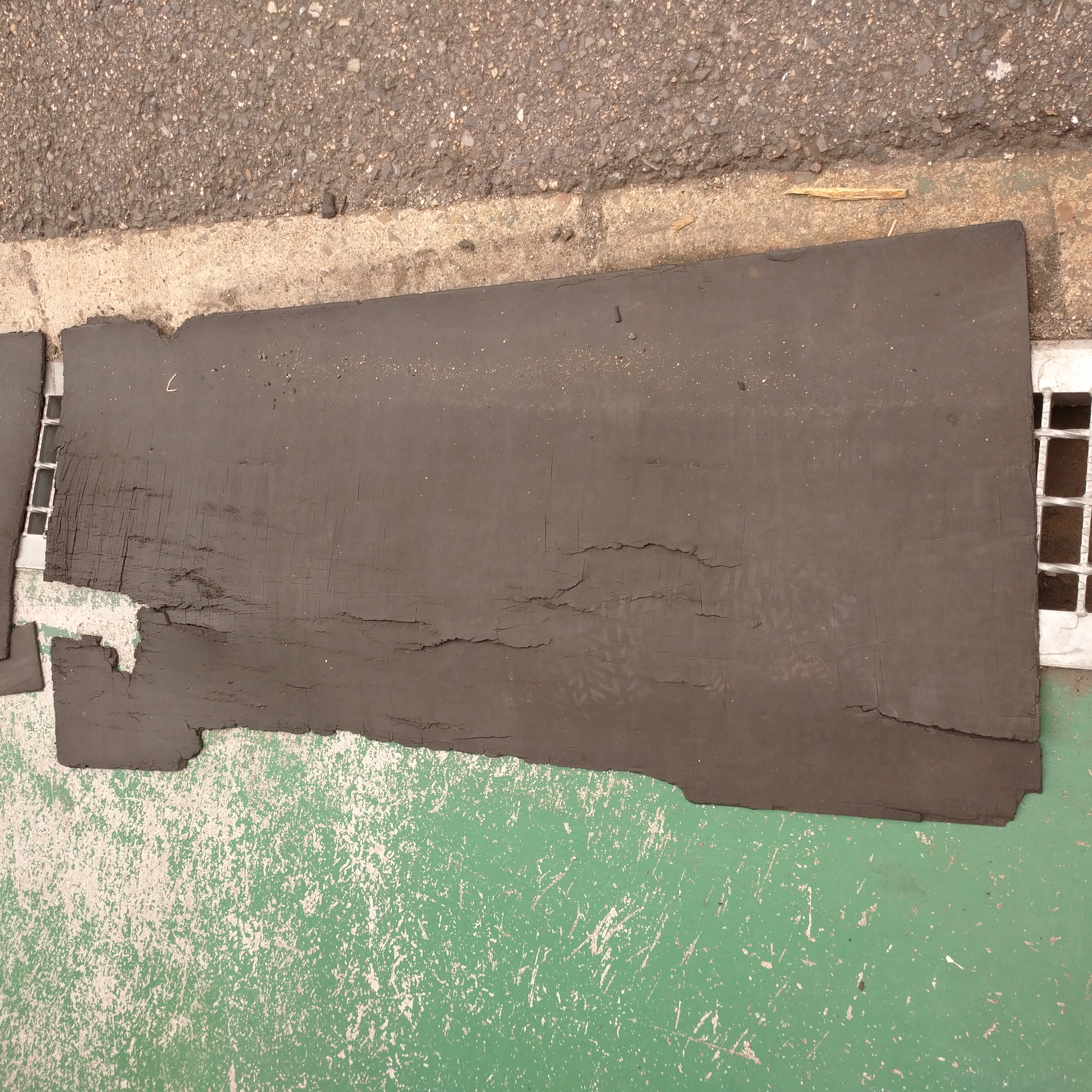 1.7トンのフォークリフトが通る場所ですので、雨の日のスリップやグレーチング破損による脱輪は大事故につながりかねないのでゴムマットを敷いて安全対策をしています。しかしゴムマットがボロボロになってきました。。。