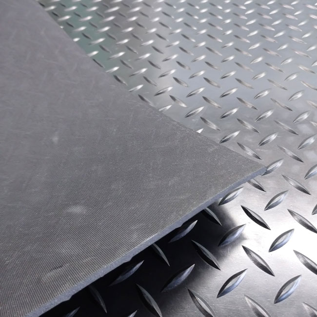 鉄板の縞鋼板模様をゴムシートにつけたてっぱんのようなゴムシートです。材質はゴムです。ゴムシートに縞模様が入っていることで全方向への滑り止め効果があることはもちろんのこと、工事現場でよく見る模様なので、歩行者への注意喚起にもなります。