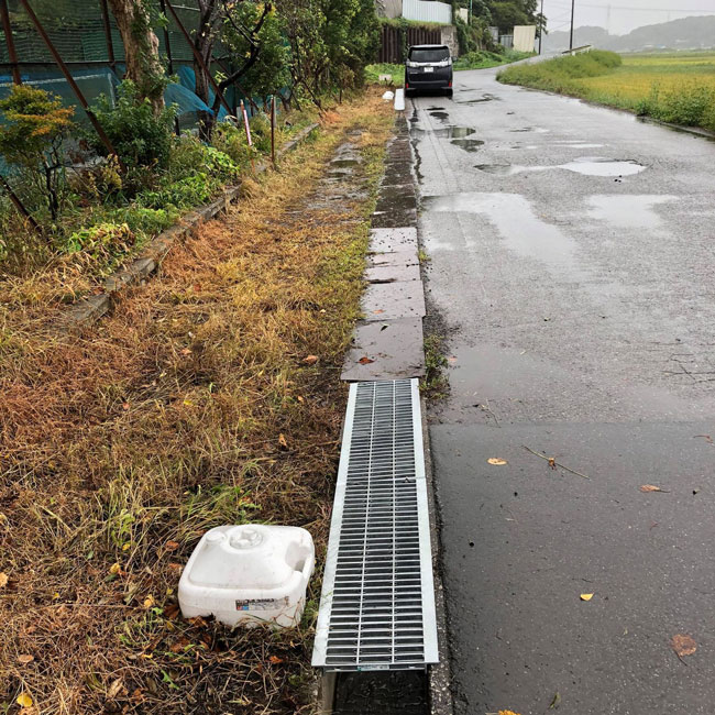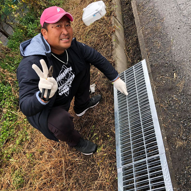 テニススクール敷地内ではなく周辺道路の溝にグレーチングがなく脱輪の恐れがあるため、安全管理上よくないということでヨナモトテニススクール様が自費でグレーチングを設置されました。通行されるのはお客様だけではないはずなので、地域貢献の一環ともいえる活動です。