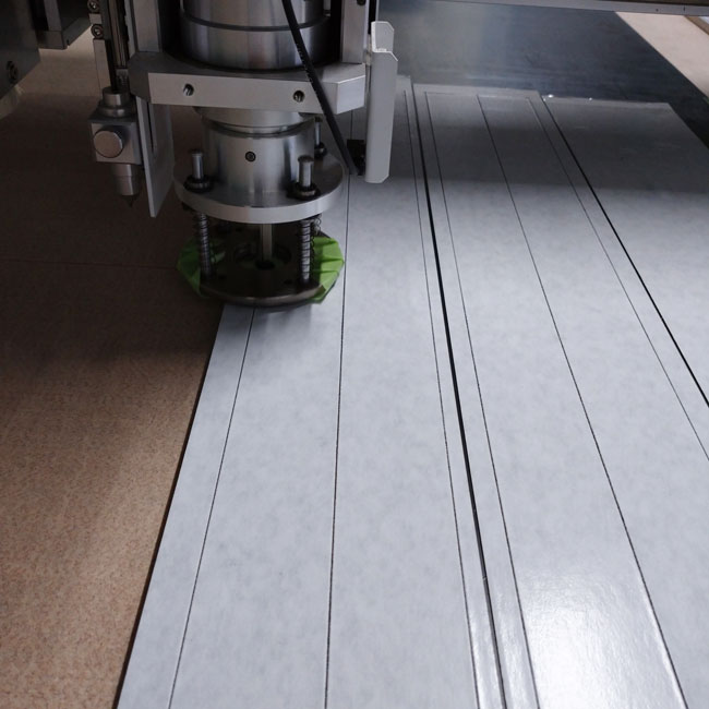 ▽幅100mmの強力な両面テープを貼り付けたゴムシートをカットしています。