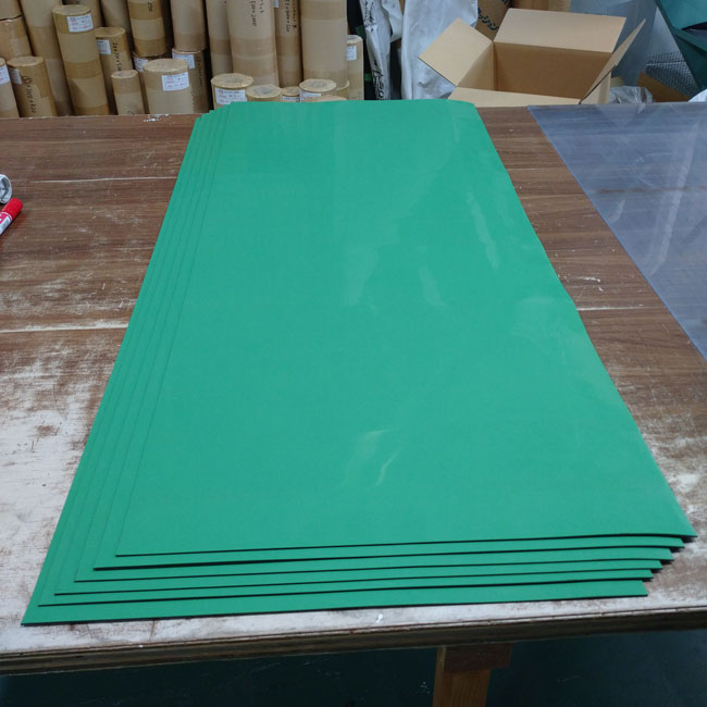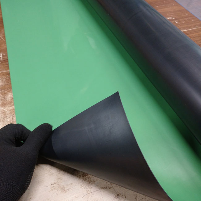 一般的には厚さ2mmで表が緑、裏が黒です。その他の厚み(3mmなど)も存在するのですが、通常は厚み2mmしかなく私たちの取り扱いも2mmのみでございます。