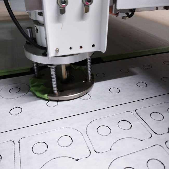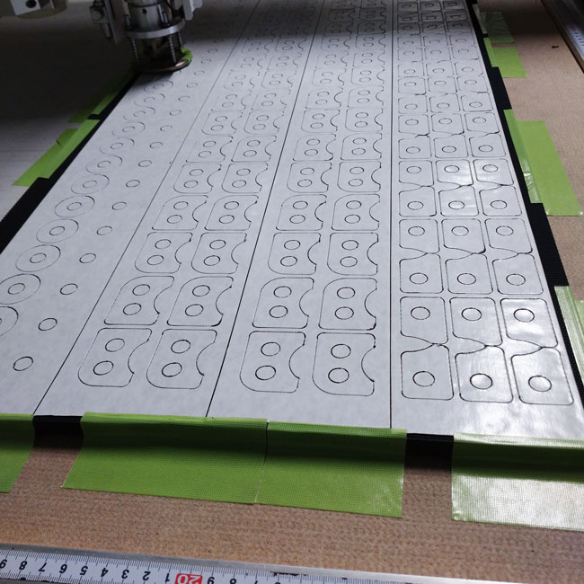 「図面があれば後は機械がやってくれる」と思われがちですが、美しく仕上げるためにはいくつかコツがあります。ゴムの巻き癖を取る、両面テープを貼ってすぐに加工しない、加工スピードの調整、刃物の微調整などです。試作を何度かさせていただいてましたので、美しく仕上げることができました。