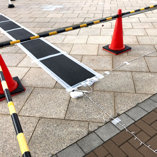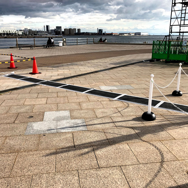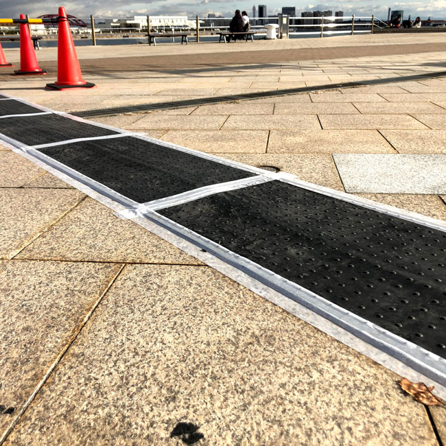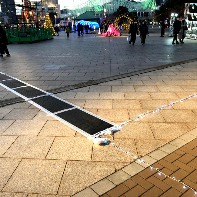 何度かご紹介している使われ方ですが、たくさん使われている現場がありましたので写真を撮ってきました。イルミネーションの電飾を灯すためのケーブルがいくつも敷かれていて、そのケーブルを保護したり足でひっかけて転倒しないためにゴムマットをケーブルの上にかぶせています。