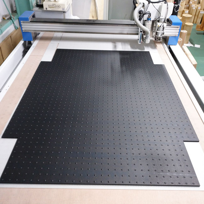 手加工でやらないといけないサイズは機械に載せられない1300×2000を超えるサイズです。大きなゴムマットを手加工で切っていくのですが、前述したように大きなサイズは寸法がズレやすいので精密な寸法が必要な箇所では適していません。例えば設置場所の鉄板の穴に合わせてカットするなどです。穴位置が狂うと目的を果たせませんので、そういう場合にはゴムマットを分割していただく方が確実です。(1000×10Mのゴムマットの両サイドに穴を40コあける場合は、1000×2000のゴムマットに穴を8コあけるなど)