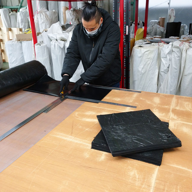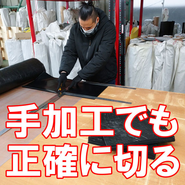 私たちも上のようなことをしてゴムをカットすることが多いです。すべて機械を使っていると機械を使わないと出来ない加工ができなくなりますので、手加工することも多いのです。道具なども個人の方が使われている道具と変わりないかと思います。こうやって皆様と近い環境で実際にカットしていますので、カット方法のご相談にもお応えしやすいのです。