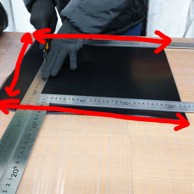 この赤矢印の意味はこの3辺で寸法を計測しているということです。こうやって計測することでカット時点での寸法はほぼ正確にでます。ただし、カット時点です。といいますのはゴムはその特性上どうしても伸縮があるからです。例えば、大阪でカットしたゴムシートを北海道に送りますと、寒さで縮みます。これは大げさな例ではなく普通に起こることですのご理解ください。