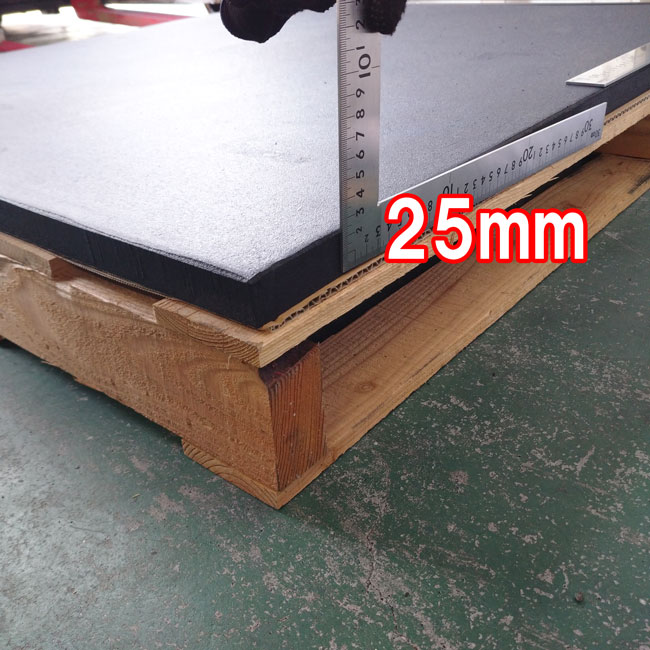 ▼ リサイクルゴム25mm厚です。1M×2Mで60kgありますので作業台に上げずにパレット上で作業いたします。ここでポイント一つ目です。切ることも大変かもしれませんが、作業スペースを確保するのも大変です。その作業スペースまで移動させるのがもっと大変です。