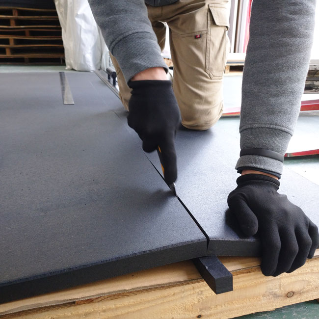 カッターナイフは非常によく切れますので、労力と時間を無視するならほとんどのゴムシートは切れます。敷き物として使うのは一般的には20mmくらいまででしょうから何とかなるものです。しかし、当り前ですが労力と時間は無視できません。これが思ったよりも辛いですし、時間もかかります。「辛い状態が長く続く」なんてイヤですよね。ですので、ぜひ私たちにカットをお任せください。今日の記事はどうしても現場で寸法合わせが必要な時のための知識としてご提供いたします。