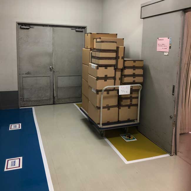 運送会社さんごとに違う色のカラーゴムシートを敷いていただきました。とても分かりやすいですよね。ちょうど、それぞれの運送会社さんの会社カラーに似通ってますね。このように識別のしやすさはカラーゴムが得意とするところです。カッティングシートでも色区別は出来、ゴムよりも発色は鮮やかですが、滑り止め効果とクッション性はゴムが勝りますね。
