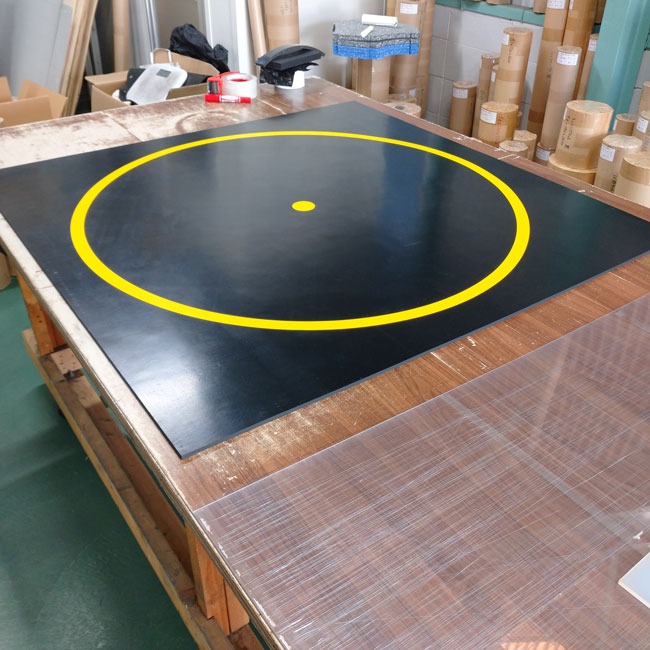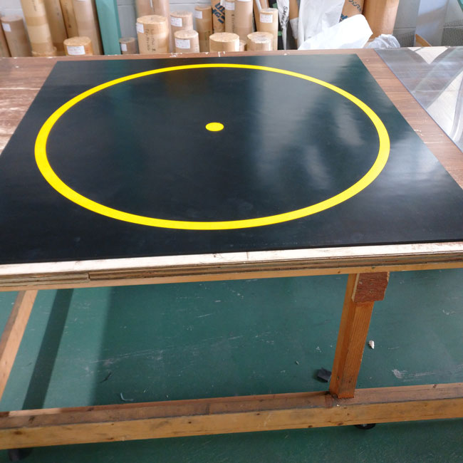 クレーン・デリック運転士の実技講習用の的をゴムシートで作らせていただきました。リピートのご依頼です。受験生の方がクレーンを操作して、地上にある的に荷物を降ろす際に使う的なので、的の直径サイズは正確な寸法でなくてはいけません。ペンキで色を塗ると薄くなって識別しにくくなったり、剥がれたりしてしまいますので、的はカラーゴムを埋め込んでいます。