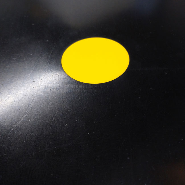 総厚6mm×1100×1100のゴムシートに、黄色カラーゴムを埋め込んでいます。6mmのカラーゴムはないため、3mmのゴムシートの上に3mmのゴムシートを貼り合わせて、上に貼り合わせたゴムシートを円形に切り抜いてカラーゴムを埋め込んでいます。貼り合わせは接着剤です。