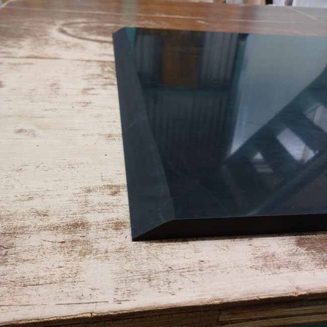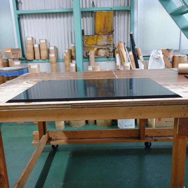 実際の製品を見ますね。詳細な寸法はお伝えできませんが、厚さ15mmで縦横ともに1M以下のサイズで両サイドにテーパーをかけています。製品全体写真だと分かりにくいかもしれませんね。