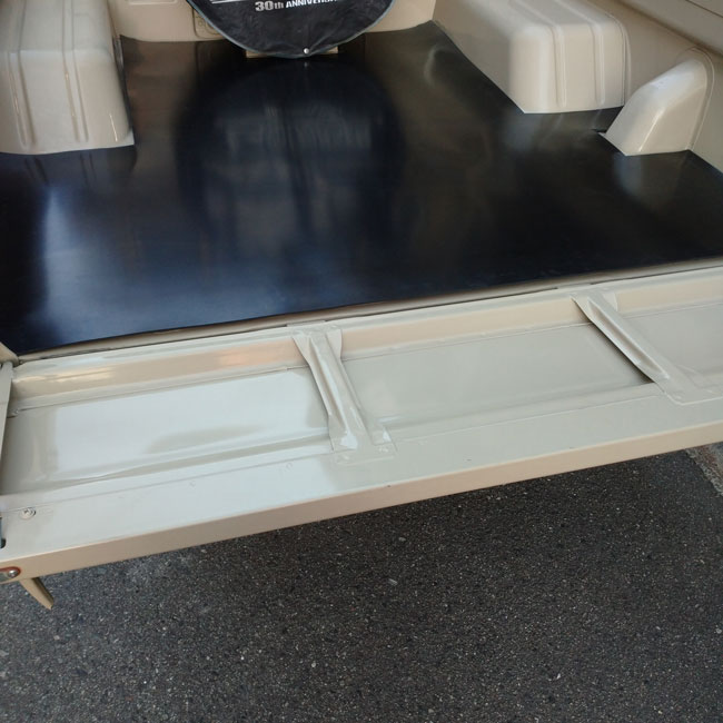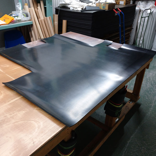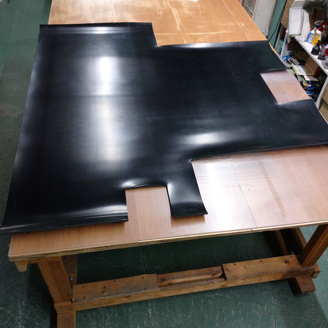 トラックの荷台ゴムマットをたくさんご注文いただきますが、タイヤハウスの影響で単純な長方形できれいに敷けない場合もあります。今日の記事はタイヤハウスの部分を切り欠きカットしてゴムマットを収めた事例です。トラックを乗ってきていただいて、私たちで採寸して当日中にカットし、翌日お引き取りしていただきました。