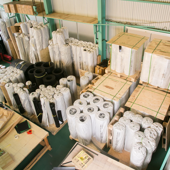 ゴムシート.comではゴムシートを大量に在庫しています。材質や厚みによって本数は様々ですが、常時40~50トンの在庫を保有しています。大量のゴムシートが急遽必要でどこを探しても見つからない、納期が間に合わないなどの場合はぜひお問い合わせください。自社在庫ですので、在庫有無の回答もお待たせすることはありません。