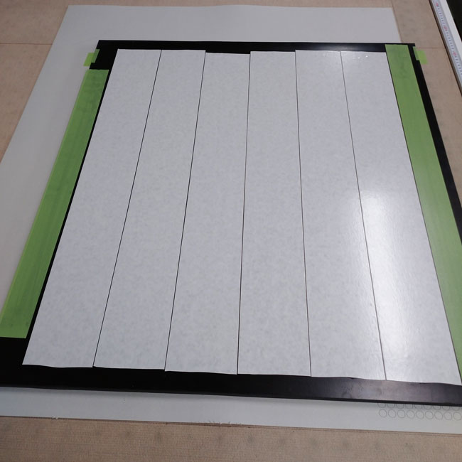 ▽ このような感じです。幅600mmちょっとのゴムシートに幅100mmの強力な両面テープを6枚並べて貼っています。継いで貼るので継ぎ貼りです。
