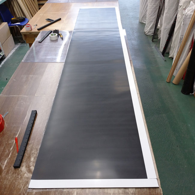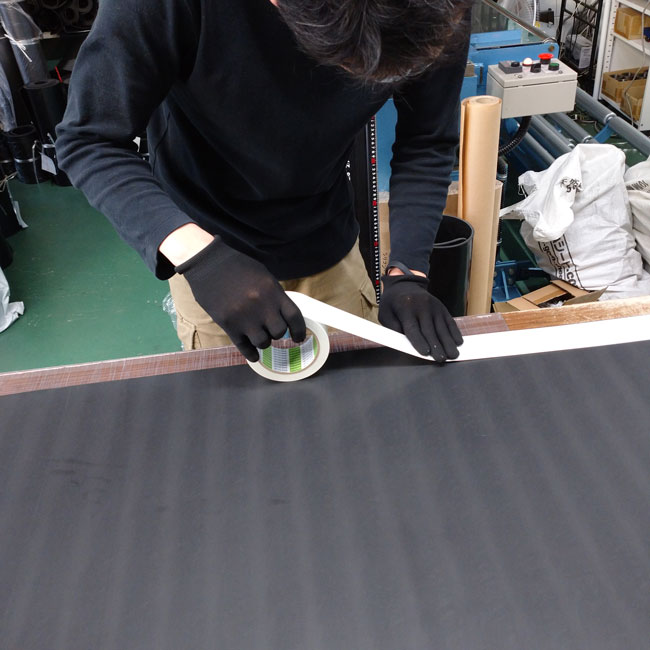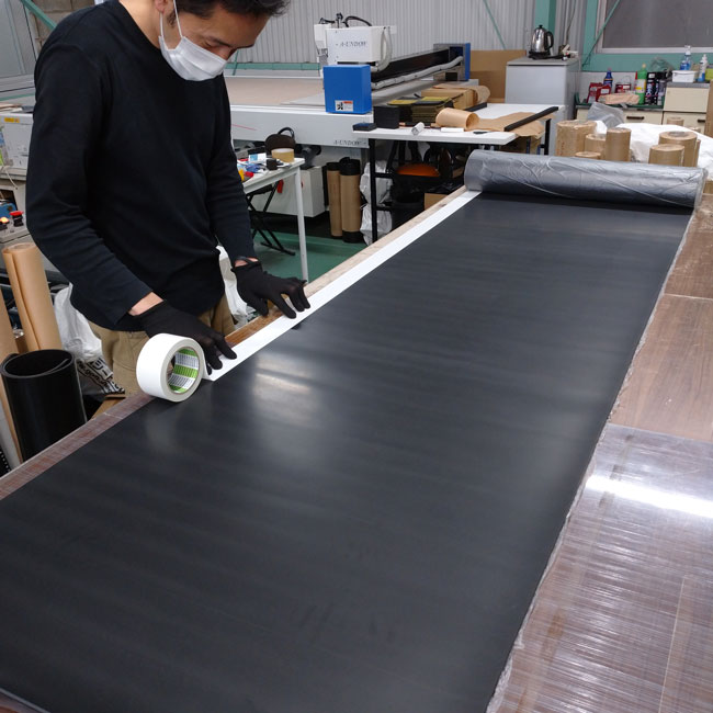 両面テープを貼り付けるお仕事依頼はたくさんいただきますが、通常はゴムシートの片面全面に貼り付けて納品いたします。今回のご依頼は全面ではなくご指定部分への貼り付け依頼でした。もちろん、このようなご依頼でも喜んで承っております。