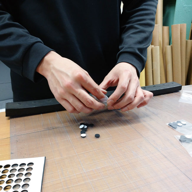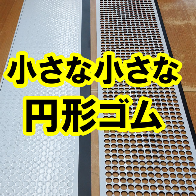 昨日の記事はゴムシートに大きな穴をあける内容でしたが、逆に小さな円形のゴムシートを作ることもできます。椅子の脚裏、テレビ台などの脚、POPの滑り止め、飛沫防止アクリル板の滑り止めなどに使いやすいかと思います。テープ付きとテープなしをお選びいただけます。