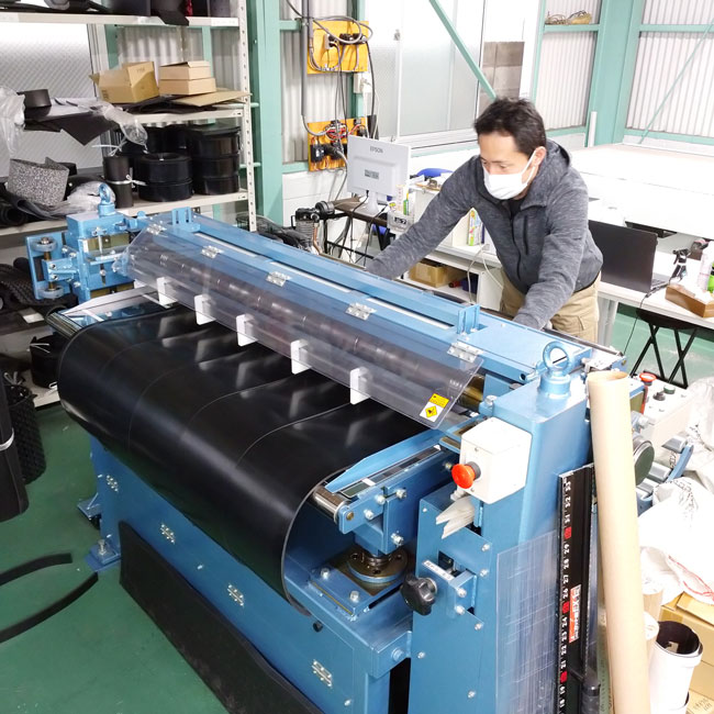 ▽ 丸ナイフが回転する機械にゴムシートを押し込んで切ります。左側に見えるゴムシートが一定間隔で切れているのが分かりますでしょうか。