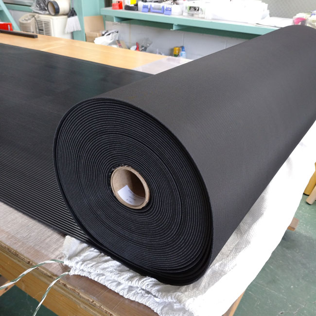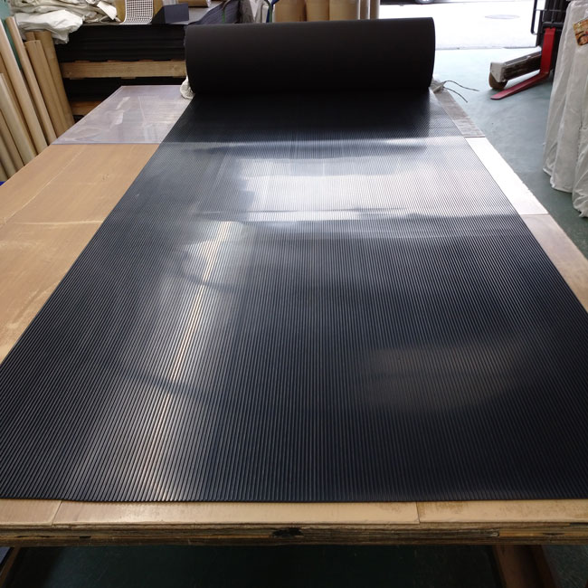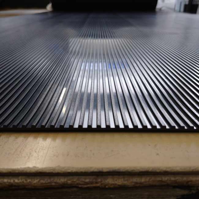合成ゴム両面エンボスもお使いいただくことがありますが、写真のように片面に筋の入ったゴムを使われることも多いです。「現在、敷いているゴムマットと同じもの」と写真を送っていただくと高い確率で写真のように筋の入ったゴムマットであることが多いです。