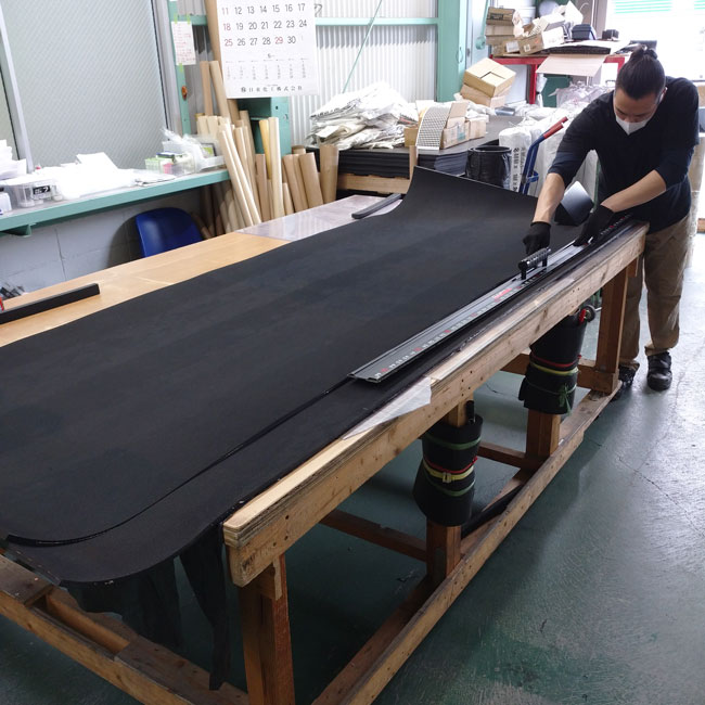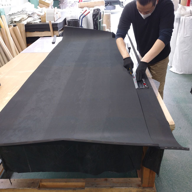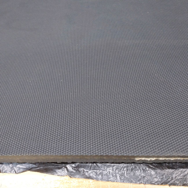 補強布入りゴムにはフラットタイプと両面エンボスタイプがあります。両面エンボスはザラザラのノンスリップ加工がされているため、スロープなどでの滑り止めに好まれます。今回、写真でご紹介しているのは両面エンボスのタイプです。