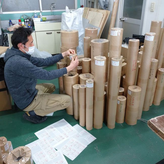 ▽ このようにしてシールを貼っています。シールには品番、サイズが明記されています。