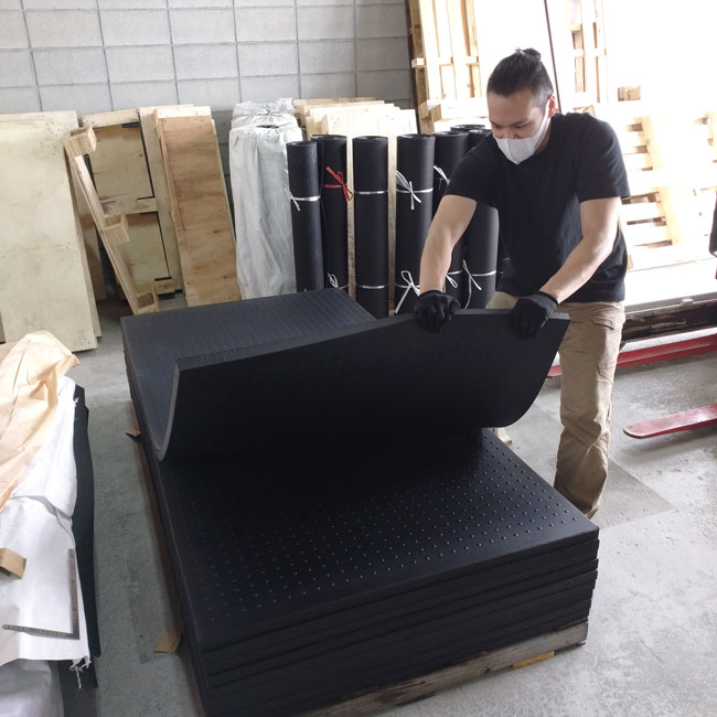 ▽ 30mmの養生ゴムマットが10枚パレットに積まれています。