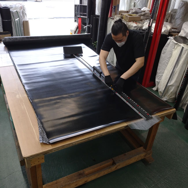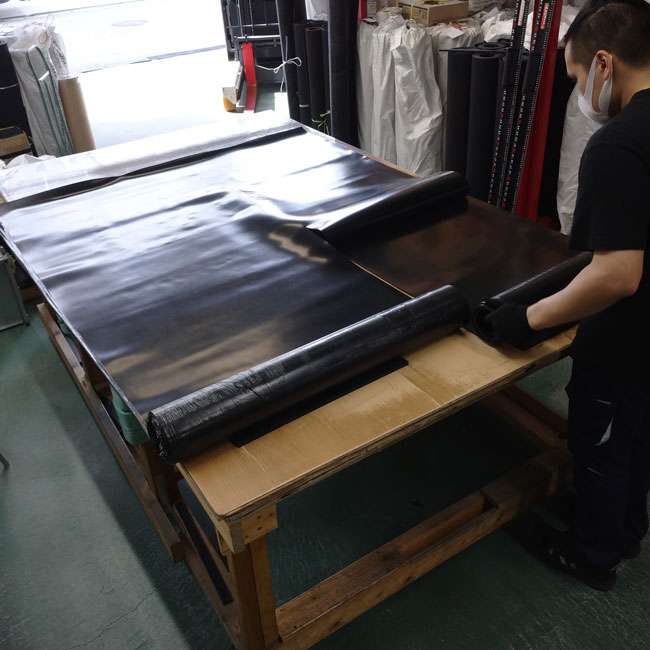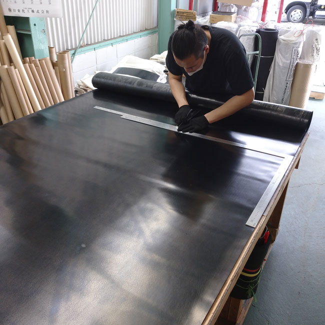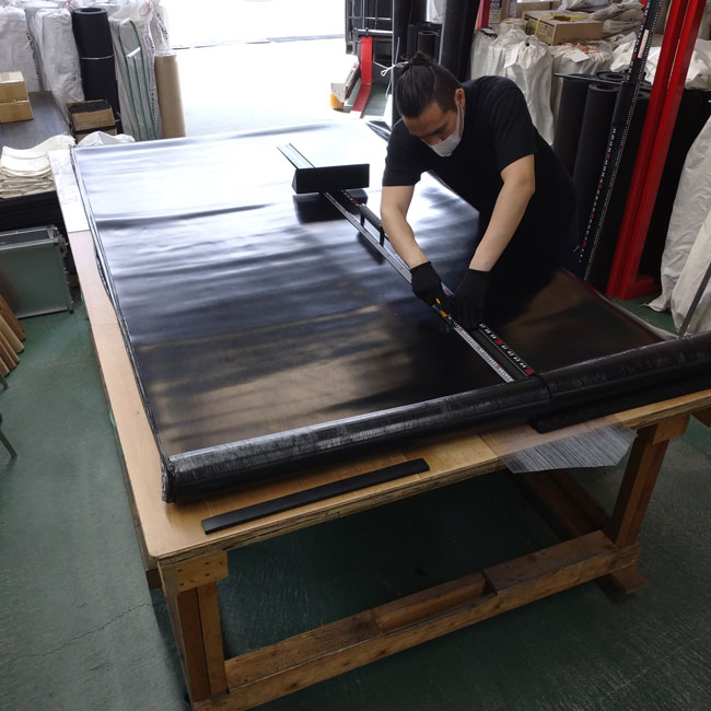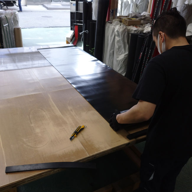 私たちは幅カットするための工作機械を使うこともありますが、1枚だけカットする場合や機械でカットできない大きさ(幅1.5Mや2.0Mなど)は手加工しています。金属ではなくゴムなのでカッターナイフで切れるのですが、正しい寸法でまっすぐ切ることは意外と難しくどうしても時間がかかってしまう加工です。