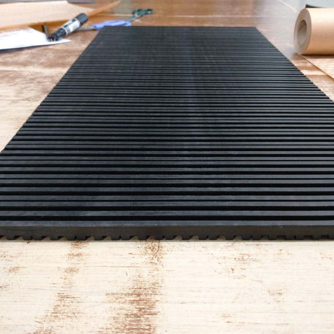 何度かご紹介したことがありますが、通常品以外で問い合わせの多い両面に筋目が入った防振ゴムのご紹介です。エアコンの室外機や機械設備の脚マットとしてよく使われている製品です。総厚は10mmありますが、筋目に沿ってカットできるのでカッターナイフがあれば現場でもカンタンにまっすぐ切ることができる便利な製品です。最大サイズが300×1000のため広く敷き詰めることには不向きですが、部分的に敷きたい(4つの脚の下など)場合には使い勝手に優れた製品です。