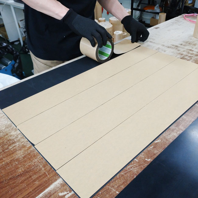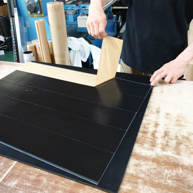 以上のような工程を経ることで端から端までピチッと両面テープで接着されている貼り合わせゴムシートを製作することができます。