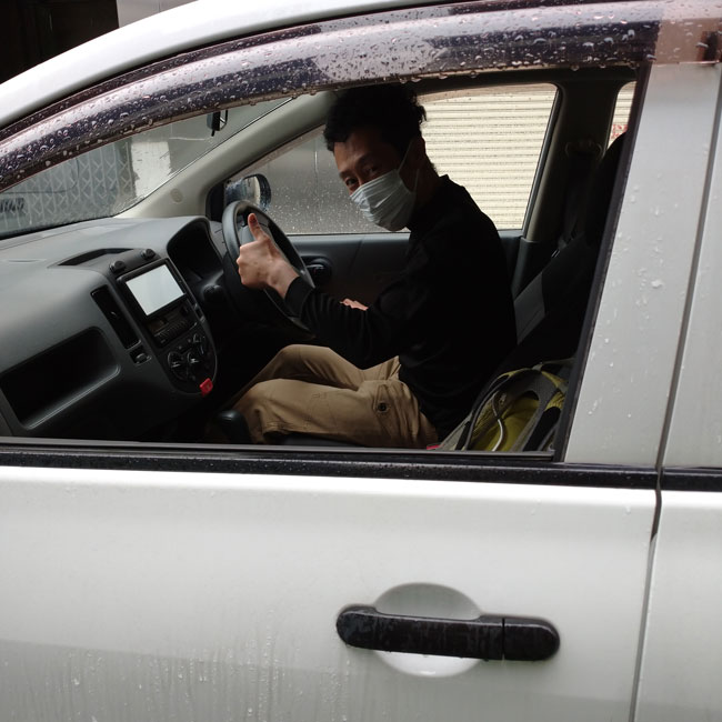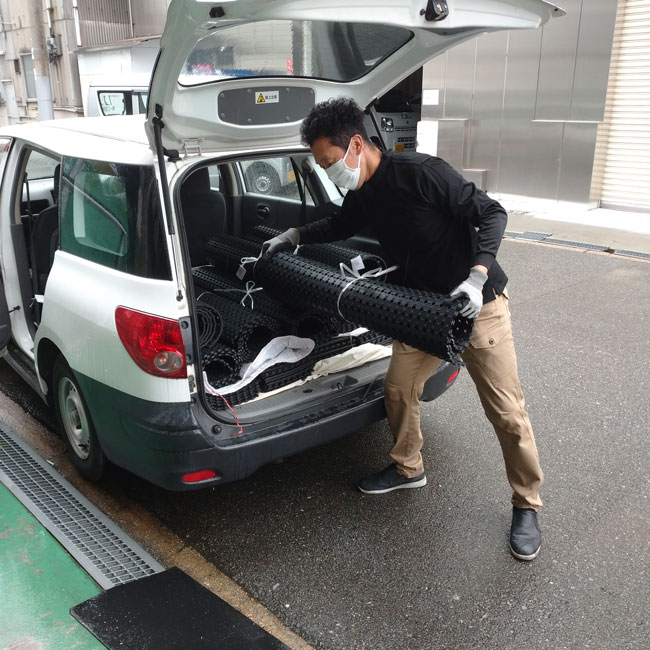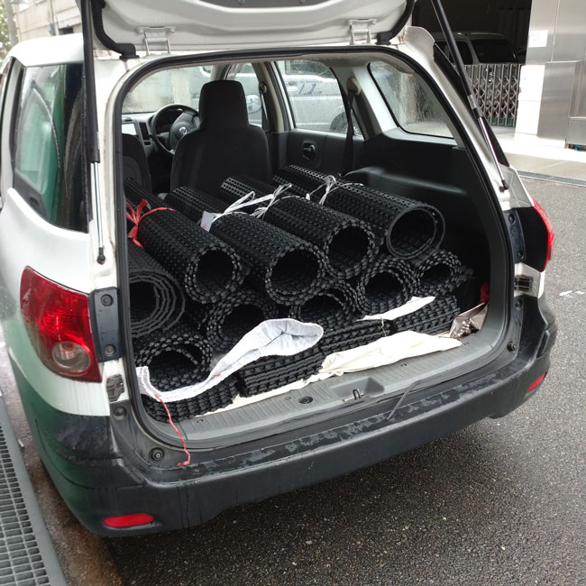 今回の配達はお急ぎではありませんでした。日程お打ち合わせの上、4件の配達に伺いました。ゴムシートは重いのですが、今回は営業車バンで2往復することでお届けすることができました。トラックで配達する際はトラックが進入できるかなど確認の上、お伺いするようにしています。