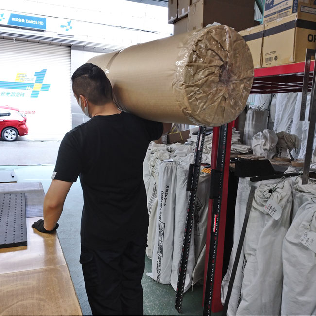 スポンジのロール品を販売しています。幅1M×長さ10Mととても大きなサイズですが、ゴムシートのように重くないので取り扱いがしやすいです。疲労軽減のため敷き物にしたり、壁や柱に貼り付けて保護クッションにしたり、などなど用途は様々です。
